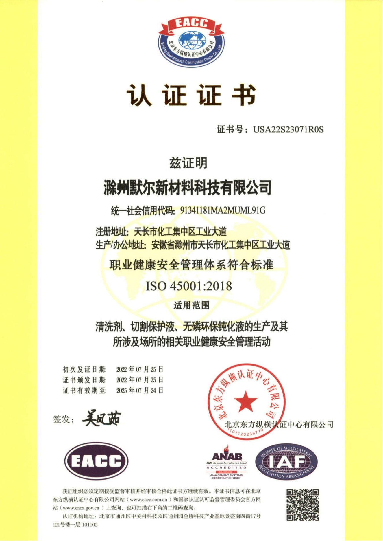 滁州默尔新材料科技有限公司,成立于2016年,位于滁州天长市铜城镇精细化工园区,工厂占地110亩,是一家致力于纳米材料、精细化学品等领域的研发、生产、销售于一体的科技型企业。企业通过了ISO9001质量管理体系认证,ISO14001环境管理体系认证,ISO45001职业健康安全管理体系认证。