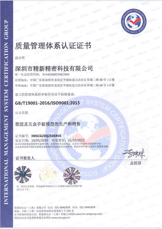 深圳市精新精密科技有限公司成立于1995年,位于中国深圳龙岗区平湖镇,具有二十多年的历史,国家高新企业,国家专精特新企业,2005年通过ISO9001质量体系认证,专业技术国内领先的大型手板模型企业,二百多名熟练的专业技师,为客户提供塑胶五金钣金手板模型制作、五金铝合金精密零件加工及小批量复制件生产,治具夹具制造,模具制造,产品研发设计,产品抄数,喷油,丝印等一站式全方位的先进技术服务。公司拥有一批国际最先进的现代化快速成型设备,88台大型CNC高速加工中心,3台五轴CNC加工中心,12SLA快速成型、1SLS激光粉末烧结快速成型,1台光学拍照式激光扫描仪,1台光学测数仪,1台三次元测数仪,3CNC自动车床,另拥有钣金数控折弯机,全自动真空复模机,低压灌注复模设备,激光镭雕,高光切斜边和CD纹设备,无尘喷油丝印车间等。涉及智能机器人,无人机,汽车整车和零配件,家用电器,医疗器械,健康运动器材,玩具,通信设备、IT消费电子、智能安防、仪器仪表、玩具礼品、照明设备、家居家电、机械设备零部件等领域。对各种外观的工新艺处理和特殊新材料有20多年丰富的专业经验。